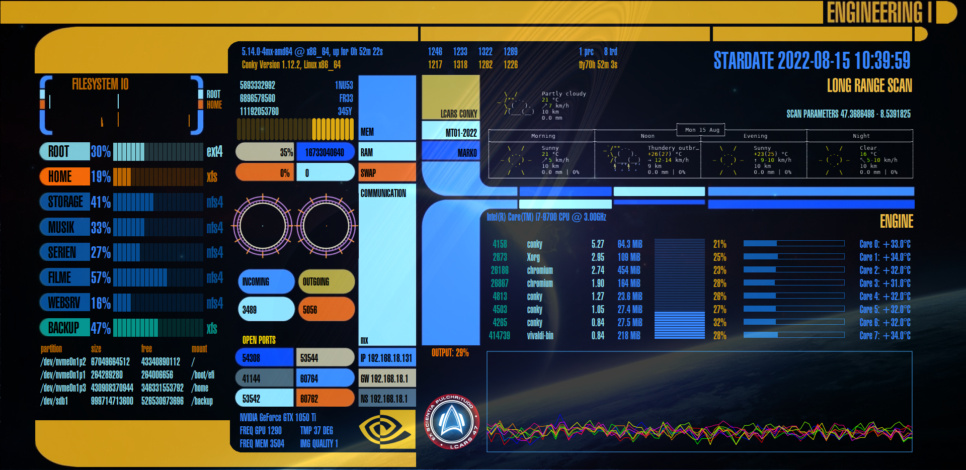 Dieses Projekt nutzt den Conky-Systemmonitor, um die Ressourcen und Leistungsdaten deines Computers in einem Star-Trek Look&Feel anzuzeigen. Conky ist ein vielseitiger Systemmonitor für den Desktop deines Linux-Computers, der hoch konfigurier- und erweiterbar ist.