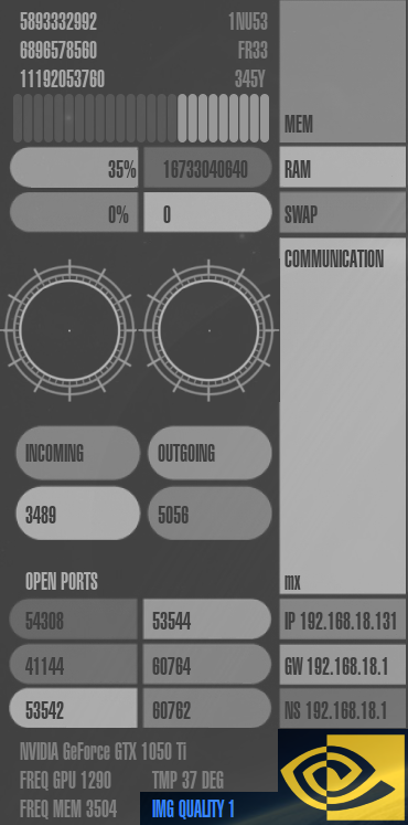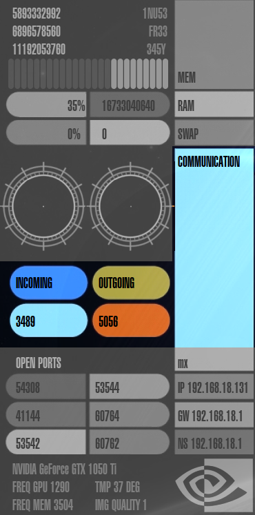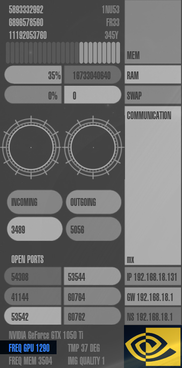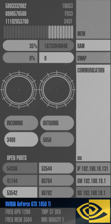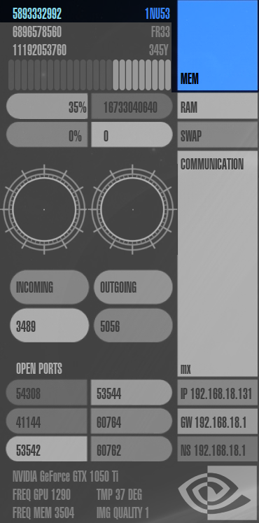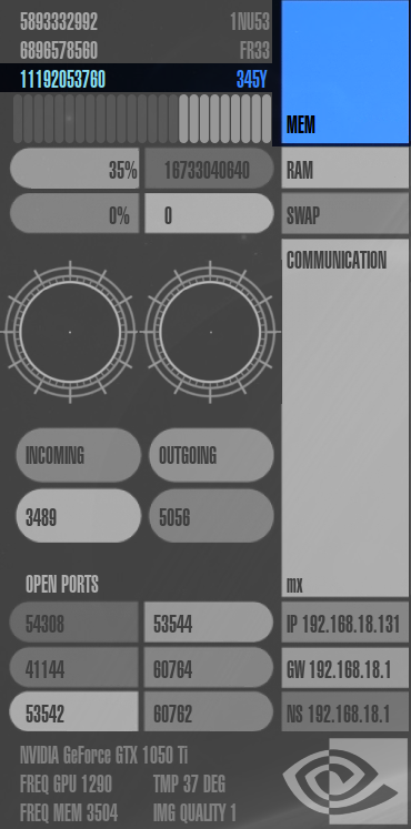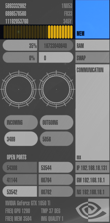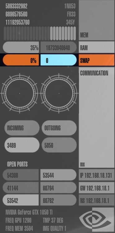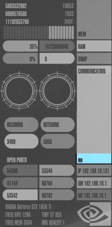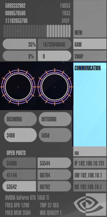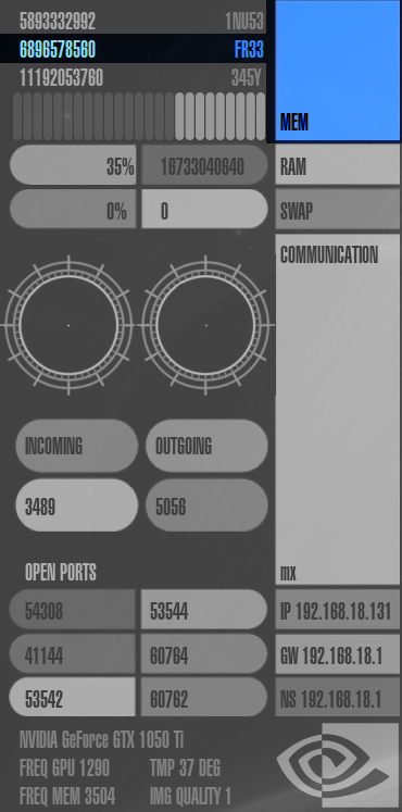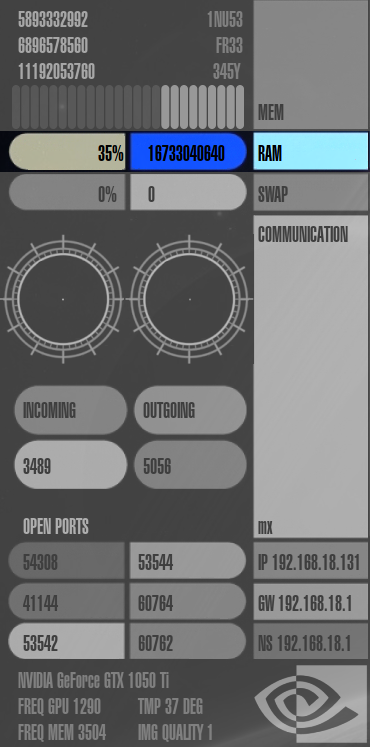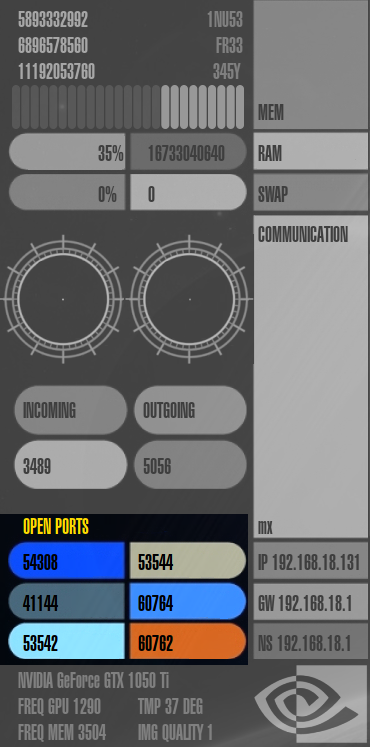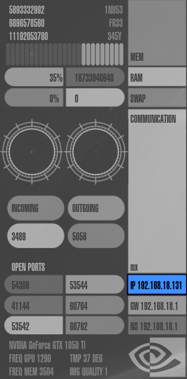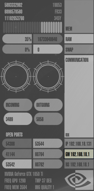 Speicherverbrauch ("mem"), RAM-Auslastung ("ram"), Auslastung der Auslagerungsdatei ("swap"), Netzwerk-Auslastung ("communication"), die IP-Adressen des Rechners, Gateways und Nameservers ("ip", "gw" und "ns"), offene Ports im System ("open ports") und Informationen zur Grafikkarte.